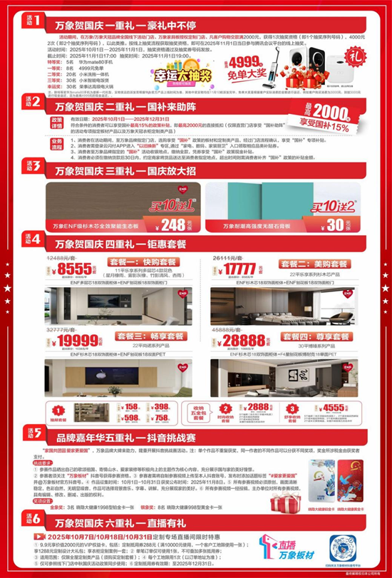 不同于傳統(tǒng)促銷“單純降價”的噱頭,此次萬象品牌結合雙節(jié)深度融合政府補貼紅利與企業(yè)品質(zhì)實力,疊加“贏華為 Mate80”等重磅驚喜,通過線上多平臺與線下全渠道聯(lián)動,構建“品質(zhì)保障+政策實惠+驚喜體驗” 三位一體的消費閉環(huán)——既讓消費者享受國補與企業(yè)讓利的雙重實惠,又以極致環(huán)保品質(zhì)筑牢健康家居根基,更能通過抽獎解鎖華為mate80、4999元免單、小米智能家電等福利,真正實現(xiàn)“品質(zhì)夠超值,福利全滿載”。