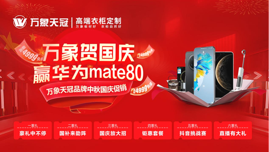 金秋十月,中秋國慶雙節(jié)疊加,家居消費市場熱潮涌動,各品牌紛紛加碼營銷釋放福利。在此競爭格局下,旺德府集團作為湖南家居建材領軍、全國行業(yè)的知名企業(yè),秉承“為千萬客戶創(chuàng)享美好健康環(huán)境”的企業(yè)愿景,傾力整合旗下兩大核心品牌——萬象板材與萬象天冠高端衣柜定制,拿出滿滿誠意讓利客戶!堅守品質(zhì)初心,實力回饋客戶,于10月1日至11月1日開展“萬象賀國慶 贏華為 Mate80” 雙節(jié)促銷活動,以“真品質(zhì)+真優(yōu)惠”為全國的消費者朋友們打造綠色家居方案,彰顯頭部品牌責任與擔當。