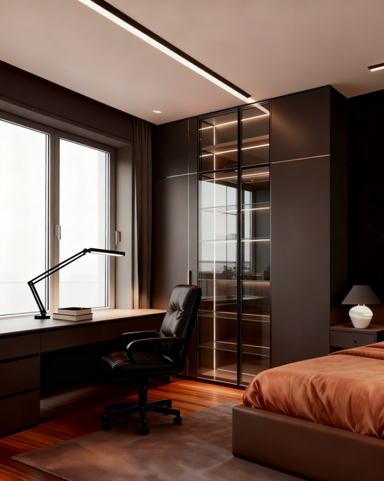 細(xì)節(jié)亮點:通過深灰色啞光柜體與透明玻璃的虛實切割,將收納功能轉(zhuǎn)化為空間視覺藝術(shù)——左側(cè)封閉柜體滿足日常衣物隱藏式收納,右側(cè)玻璃門區(qū)域以嵌入式線性燈光勾勒內(nèi)部分層結(jié)構(gòu),形成“藏露平衡”的展示邏輯。材質(zhì)上,金屬收邊條與木紋地板形成冷硬與溫潤的肌理對話,燈光設(shè)計采用“頂部漫反射+層板點光源”雙重系統(tǒng),既消除傳統(tǒng)衣柜的壓抑感,又通過光影層次強化空間縱深感。