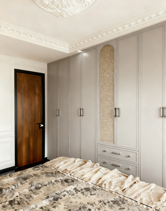 細(xì)節(jié)亮點:結(jié)合“隱奢美學(xué)×空間敘事”與浪漫法式元素,當(dāng)前柜體在極簡框架中注入優(yōu)雅細(xì)節(jié)。柜體結(jié)構(gòu)采用封閉+開放分區(qū)設(shè)計:左側(cè)深灰啞光封閉柜以豎向線條分割,搭配金屬拉手;中間藤編內(nèi)置層弧形拱券造型嵌入,頂部石膏線浮雕與墻面裝飾線條呼應(yīng),整體通過材質(zhì)碰撞與光影層次實現(xiàn)儲物功能與法式浪漫的融合。