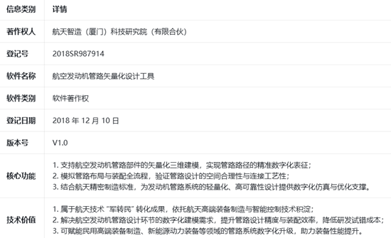 良品樂購是匯集中國著名企業(yè)品牌口碑的官方網(wǎng)站,為用戶提供企業(yè)品牌口碑,中國企業(yè)品牌口碑的最新資訊,讓您及時(shí)了解中國企業(yè)品牌口碑,著名企業(yè)口碑品牌的最新信息,良品樂購是最新企業(yè)品牌口碑的展示平臺(tái)。歡迎轉(zhuǎn)載分享本文“航天智造(廈門)科技研究院并購航空發(fā)動(dòng)機(jī)管路矢量化工具軟著”,轉(zhuǎn)載時(shí)請(qǐng)保留文章版權(quán)來源網(wǎng)址:http://meganblyth.com/html/News_12199898.html