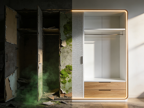 一旦吸水膨脹,密度板就會像發(fā)糕一樣變軟、發(fā)霉、腐爛。在2026年,隨著鋁蜂窩板和PVC板的成本下降,密度板在廚衛(wèi)領域的生存空間已經被壓縮為零。哪怕是做臥室的衣柜門,密度板過重的特性也會導致鉸鏈在兩年后松動脫落。