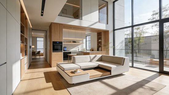 智能折疊家具: 推薦選擇電動隱形床(墨菲床),一鍵收起變成柜子;或者智能升降茶幾,秒變餐桌。
