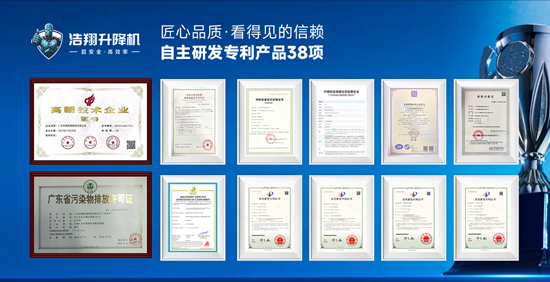 浩翔升降機始終堅守品質底線,已成功獲得特種設備生產許可證《TS2444360-2027》、質量管理體系認證《GB/T 19001-2016/ISO 9001:2015》及高新技術企業(yè)認證《GR202344017911》,以權威資質背書產品合規(guī)性、可靠性與創(chuàng)新力。