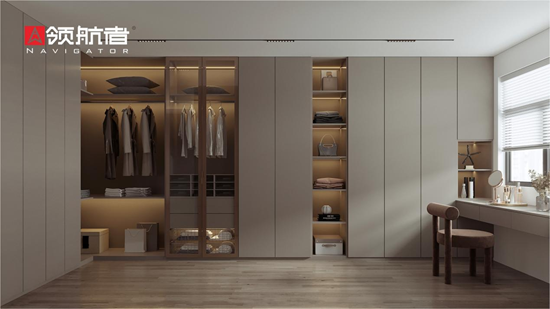 ·臥室的輕奢,是能“卸下疲憊”的溫柔休憩場(chǎng)。領(lǐng)航者家居定制的整體衣柜,柜門選“膚感啞光板”,觸感如云朵般柔和親膚。更藏著貼心定制細(xì)節(jié):衣柜內(nèi)側(cè)預(yù)留掛長(zhǎng)衣的高區(qū)、放包包的隔層,每一處設(shè)計(jì)都提前關(guān)照生活需求,讓輕奢不止有視覺(jué)上的精致,更延伸到使用時(shí)的妥帖舒心。
