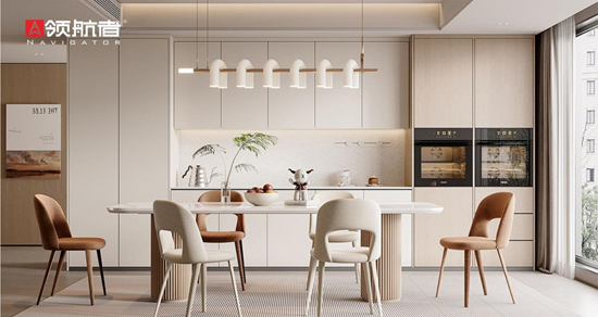 餐廳·品味時(shí)光:圓月映窗,美食滿(mǎn)桌,餐廳是團(tuán)圓宴飲的溫情據(jù)點(diǎn)。領(lǐng)航者家居定制的餐桌椅與餐邊柜,兼顧材質(zhì)堅(jiān)固與線(xiàn)條圓融——所選板材耐磨耐劃、易清潔打理,即便聚餐再熱鬧,也能從容應(yīng)對(duì)。