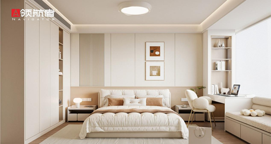 臥室·靜謐港灣:熱鬧過(guò)后,一方寧?kù)o私密的臥室是身心休憩的歸宿。領(lǐng)航者家居定制的衣柜、床頭柜與飄窗組合,分區(qū)規(guī)劃合理,收納井然有序,營(yíng)造出整潔舒緩的休憩氛圍,伴你每一夜安穩(wěn)入眠。
