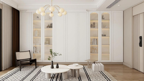 客廳的整面嵌入式定制柜以星月白為主調(diào),柜門帶著柔美的弧度線條,中間嵌入帶暖光的玻璃開放格,擺著的器皿像藏在空間里的小驚喜,讓整個(gè)家輕盈又治愈。