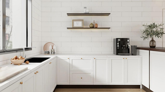 廚房用滿墻也以星月白定制柜做基底,黃銅小拉手添了精致感,黑色廚電與純白柜體形成柔和碰撞,清爽又溫柔。