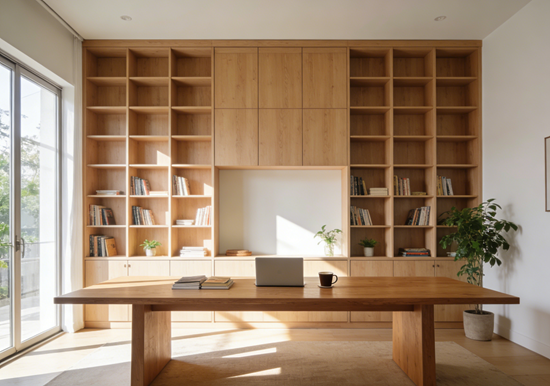 用書墻和長桌代替電視墻,將客廳打造為全家人的精神角落。孩子在此做作業(yè),大人在此辦公閱讀,陽光透過窗戶灑在書頁上——這是最溫暖的家庭畫面。