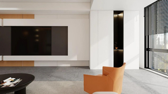 陽(yáng)光穿過(guò)白紗漫進(jìn)空間,白色柜體與米脂白墻面暈出柔和的光影邊界;滿墻收納柜嵌入了帶燈光的黑色開放格,和白、米色調(diào)形成層次,連沙發(fā)旁的落地?zé)艟條,都像風(fēng)掠過(guò)空間留下的輕痕。暖橙色單椅與淺灰抱枕,又給這份柔和添了點(diǎn)鮮活的溫度。